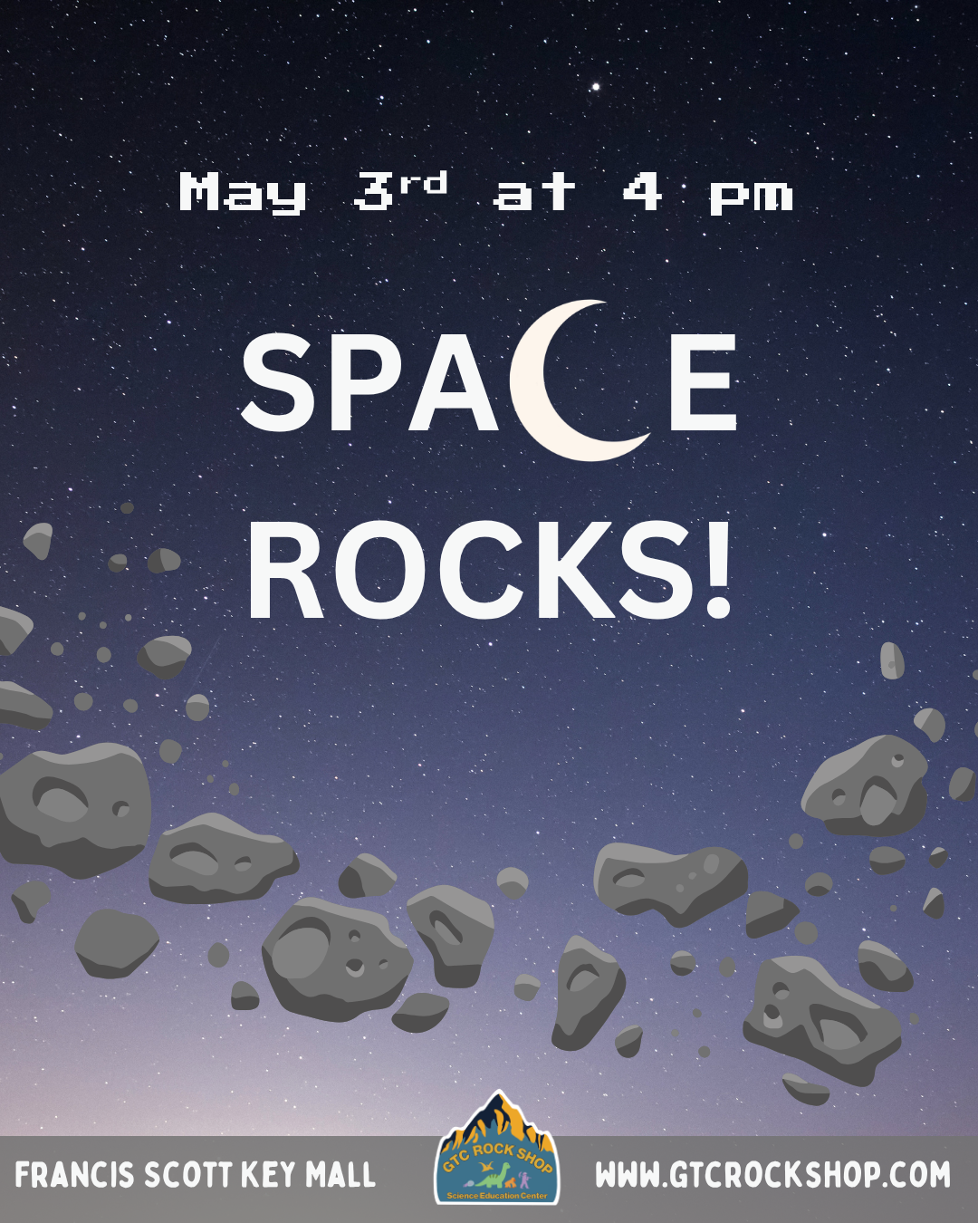 Space Rocks! - an out-of-this-world lecture where you can explore the wonders of the universe up close! Join us at the GTC Rock Shop to learn all about meteorites, moon rocks, and more! You might even get a chance to handle some yourself!